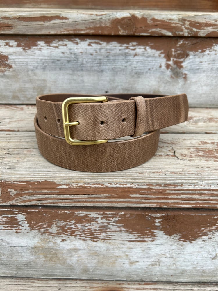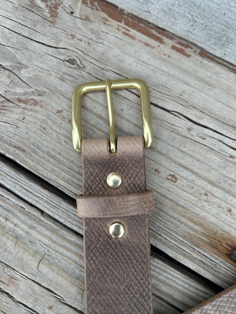 Custom belt made of premium leather, Horween natural Chromexcel. Current batch has tannery finish backs - minimizes stretch - and features a very limited Horween hatch grain embossed print.